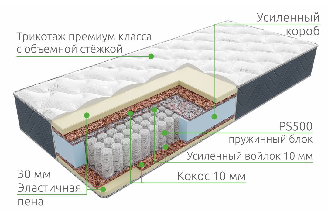 Матрас на пружинном блоке PS 500 с средней степенью жесткости, высотой 21 см и максимальной нагрузкой - 150 кг на спальное место. Материал: пенополиуретан, войлок, термовойлок, пружинный блок (ПБ). Чехол из синтетического жаккарда с объемной стёжкой.